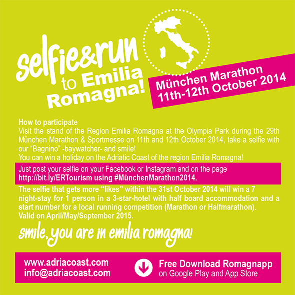 Visit the stand of the Region Emilia Romagna at the Olympia Park during the 29th München Marathon & Sportmesse on 11th and 12th October 2014, take a selfie with our “Bagnino” -baywatcher- and smile!
