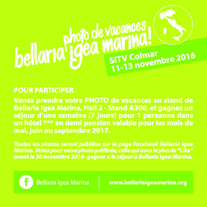 Venez prendre votre photo de vacances au stand de Bellaria Igea Marina au Salon Internationale du Tourisme et des Voyages à Colmar du 11 au 13 novembre 2016 et gagnez un séjour d'une semaine (7 jours) pour 1 personne dans un hotel *** en demi pension valable pour les mois de mai, juin ou septembre 2017.