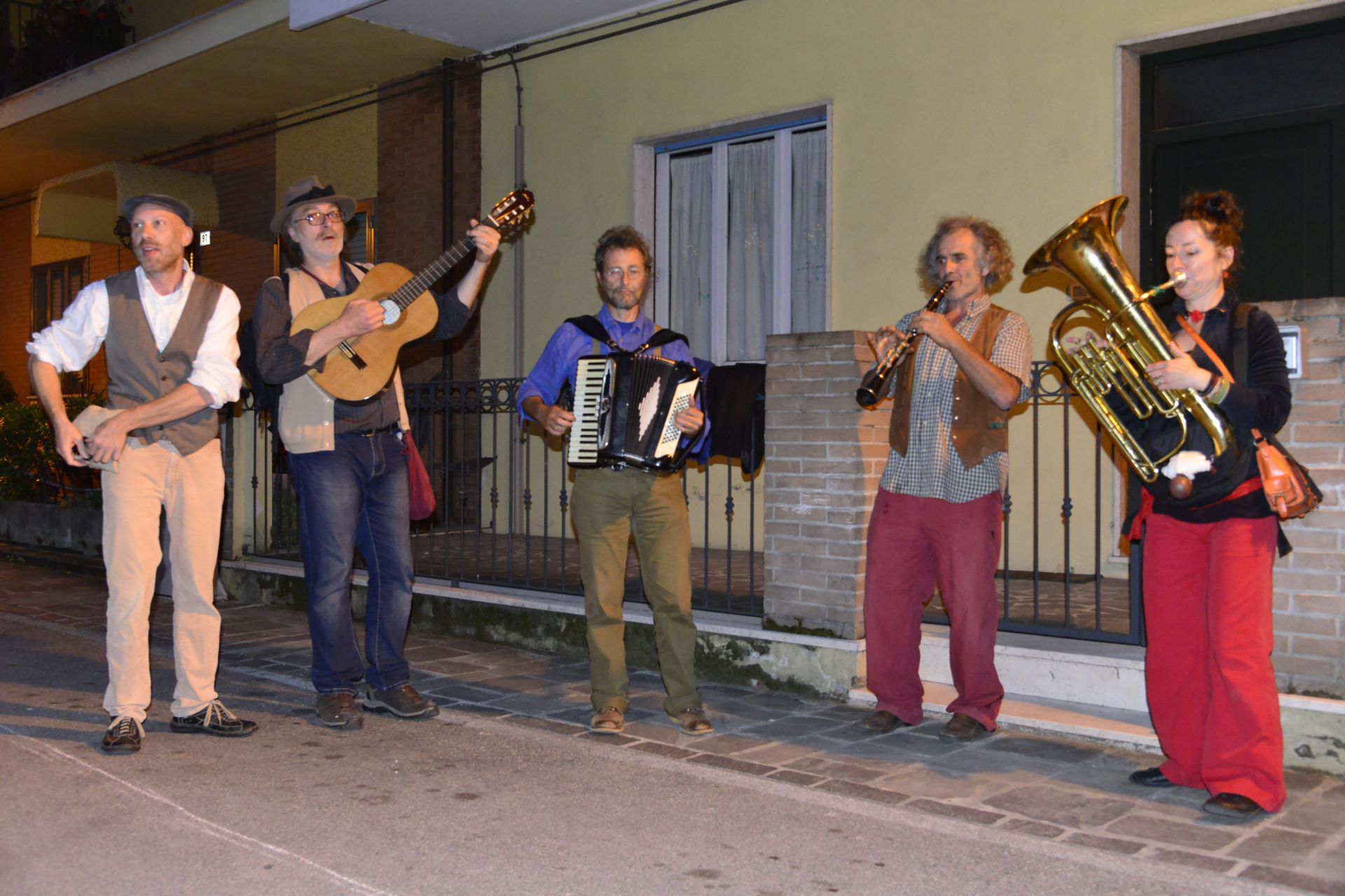 Tutti i suonatori, a tempo di musica, si recano in corteo al Teatro Astra, percorrendo le vie Romea, Ionio, Tirreno, Paolo Guidi.