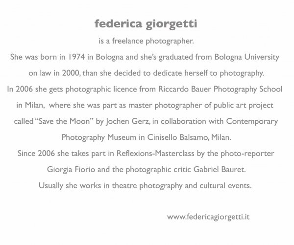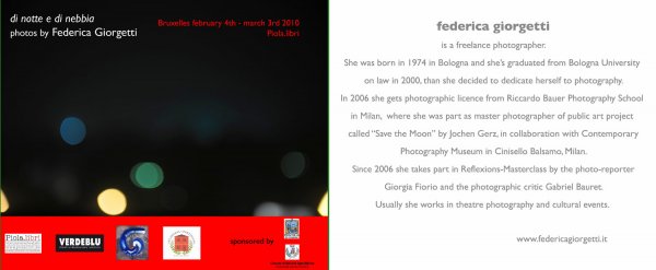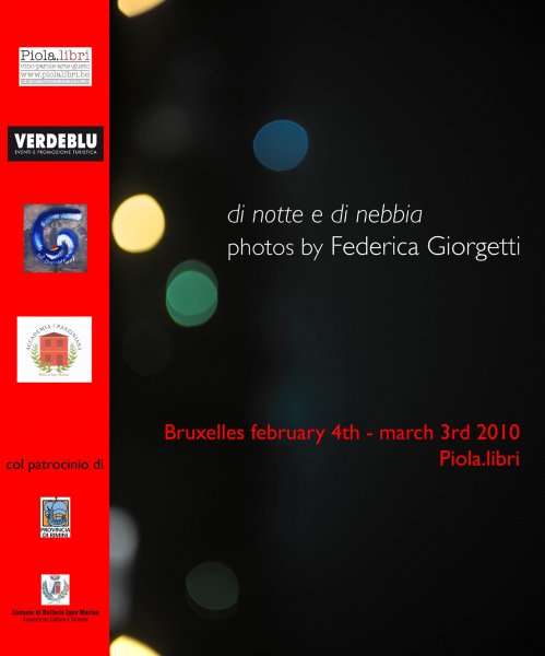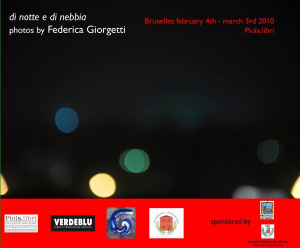 La fotografa bellariese Federica Giorgetti (35 anni), presenta nello spazio indipendente della biblio-enoteca “Piola.libri” di Bruxelles, dal 4 febbraio al 3 marzo, la mostra fotografica “Di Notte e di nebbia, Poetica di uno sguardo fragile”. Quindici scatti suddivisi in tre sezioni: accanto a lune sfuggenti, Federica presenta stralci di una città (Bellaria Igea Marina) malinconica e 'spappolata' dalla nebbia.