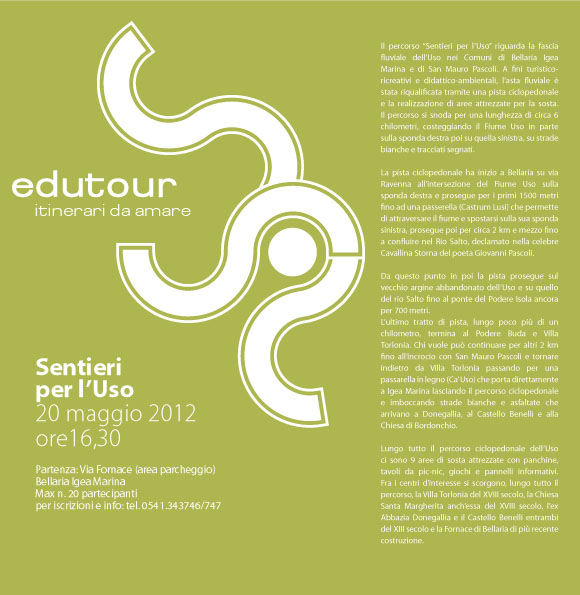 Una camminata (o biciclettata) fino a Villa Torlonia, percorrendo per 6 chilometri gli argini del fiume. Durante il percorso sono illustrati i tratti naturalistici ed idrografici del tragitto, la flora e la fauna e si approfondisce la conoscenza della storia e delle tecniche agricole, degli insediamenti storici, quali il Castello Benelli, Donegallia, Castello dell’Uso, Villa Torlonia, attraverso sollecitazioni e spunti letterari tratti dalle opere di Giovanni Pascoli e Alfredo Panzini.