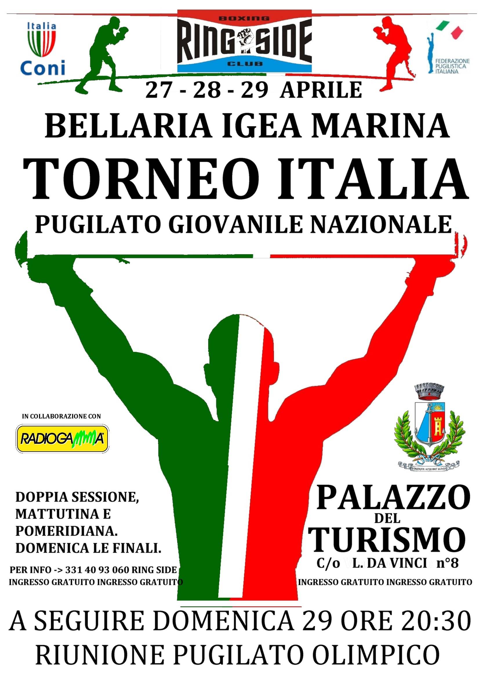 Dal 27 al 29 Aprile la Boxe giovanile italiana avrà il suo Centro di gravità a Bellaria-Igea Marina, dove sul Ring del Palazzo del Turismo si svolgerà il "Torneo Italia". Una competizione, indetta dalla F.P.I. ed organizzata in collaborazione con l’Associazione Sportiva ASD RING SIDE, adedicata alle categorie Schoolboys, Junior e Youth.