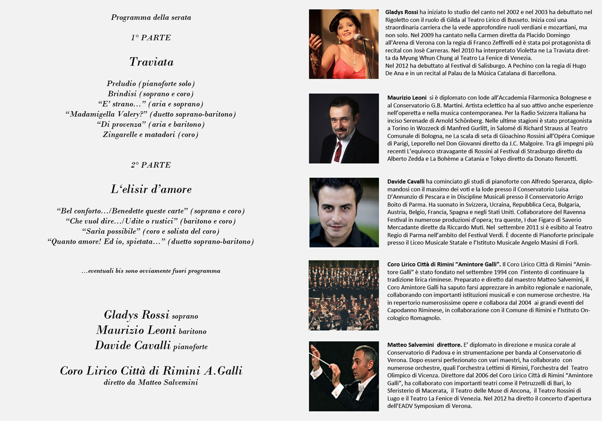 Gladys Nadia Rossi con il baritono Maurizio Leoni, il pianista Davide Cavalli e il Coro Lirico Città di Rimini A. Cavalli diretto da Matteo Salvemini.