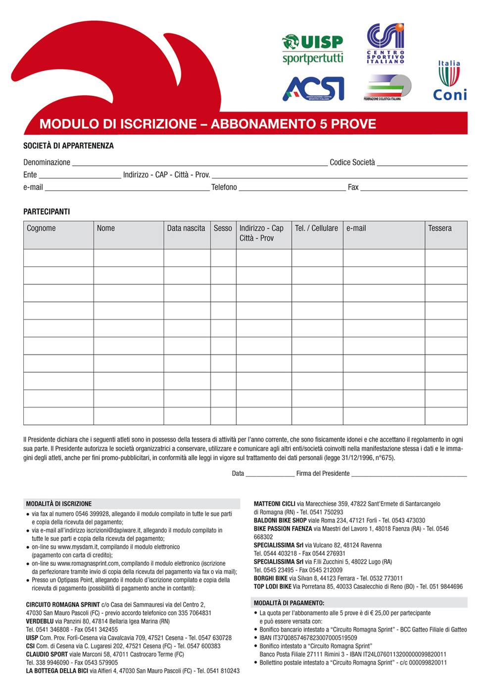 Singola prova Euro 7,00 - Abbonamento 5 prove Euro 25,00
