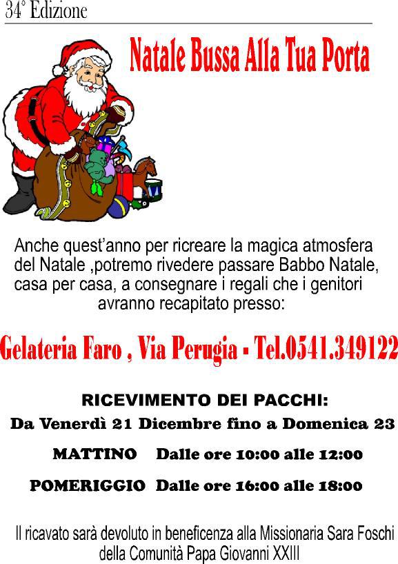 I doni vanno consegnati presso la Gelateria Faro, Via Perugia, Bellaria entro il 23 dicembre 2012, secondo i seguenti orari: mattino ore 10.00-12.00 e pomeriggio ore 16.00-18.00.