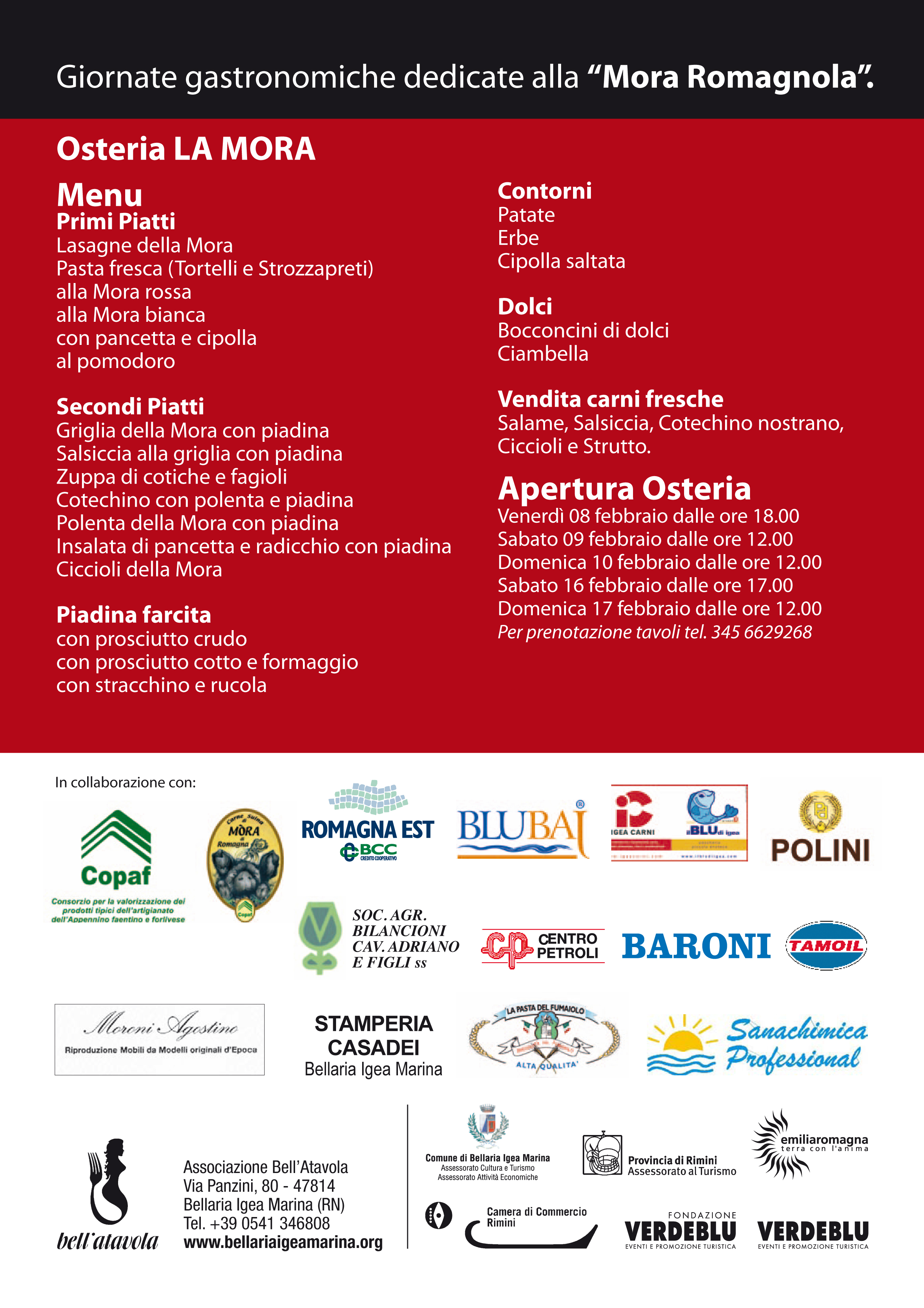 Nei week end 8.9.10 e 16.17 febbraio 2013 vi aspettiamo con i menu speciali a base di carne di mora romagnola, dimostrazione di norcineria e vendita di prodotti tipici.