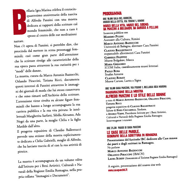 La mostra, curata da Marco Antonio Bazzocchi, documenta l’interesse di Panzini nei confronti del mondo femminile attraverso le immagini dei giornali di moda che lui stesso conservava e che sono rimasti nell’Archivio dello scrittore. L’attenzione viene rivolta su alcune figure femminili che hanno a lungo accompagnato la sua carriera pubblica e la sua vita privata: le intellettuali Margherita Sarfatti, Sibilla Aleramo, Ada Negri da una parte, la moglie Clelia e la figlia Matilde (Titì) dall’altra.