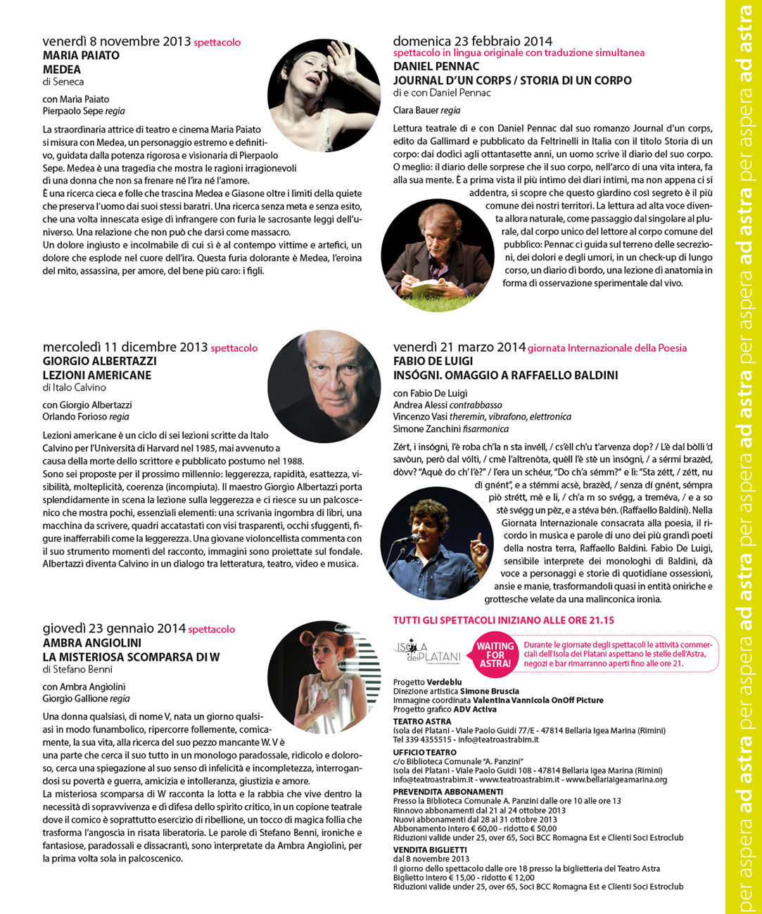 Bellaria Igea Marina prosegue la sua ascesa dalle avversità alle stelle con la nuova stagione teatrale per aspera ad astra 13.14: cinque imperdibili appuntamenti che portano sul palco dell'Astra attori e autori straordinari di cinema, teatro e letteratura. La messa a fuoco nuova di un teatro che sceglie di portare in scena progetti speciali, nelle più diverse forme artistiche, un programma che punta alla qualità degli spettacoli e all’eccellenza dei nomi, che privilegia ancora una volta la prosa e la matrice letteraria delle rappresentazioni. Riferimenti indiscussi della scena contemporanea, i protagonisti di per aspera ad astra 13.14 sono nomi straordinari del teatro e della letteratura: Maria Paiato, Giorgio Albertazzi, Ambra Angiolini, Daniel Pennac e Fabio De Luigi.