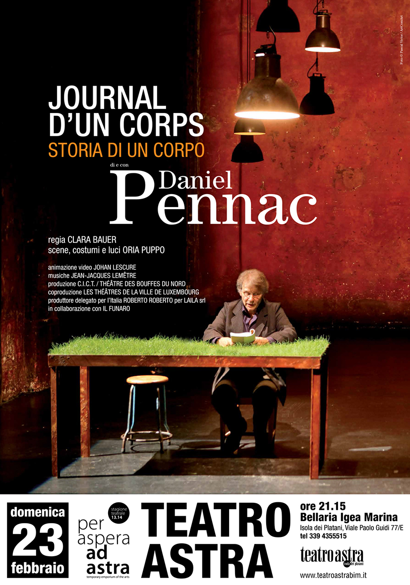 Lettura teatrale di e con Daniel Pennac dal suo romanzo Journal d’un corps edito da Gallimard e pubblicato in Italia da Feltrinelli con il titolo di Storia di un Corpo: dai 12 agli 87 anni un uomo scrive il diario del suo corpo. O meglio: il diario delle sorprese che il suo corpo, nell’arco di una vita intera, fa alla sua mente. E’ a prima vista il più intimo dei diari intimi, ma non appena ci sia addentra, si scopre che questo giardino così segreto è il più comune dei nostri territori. La lettura ad alta voce diventa allora naturale, come passaggio dal singolare al plurale, dal corpo unico del lettore al corpo comune del pubblico: Pennac ci guida sul terreno delle secrezioni, dei dolori e degli umori, in un check-up di lungo corso, un diario di bordo, una lezione di anatomia in forma di osservazione sperimentale dal vivo.