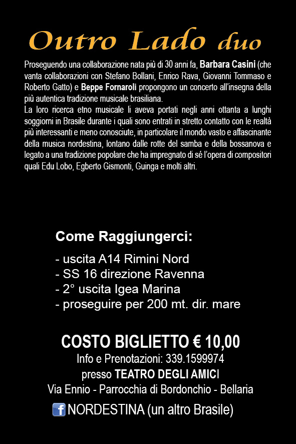Proseguendo una collaborazione nata pi di 30 anni fa, Barbara Casini e Beppe Fornaroli propongono un concerto all'insegna della più autentica tradizione musicale brasiliana.