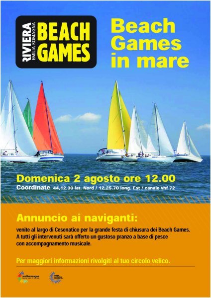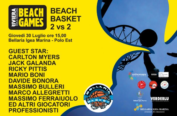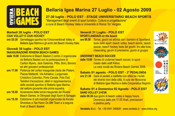 Olimpiadi degli sport di spiaggia. Sulle spiagge della Riviera Adriatica eventi di beach volley, beach hockey, beach tennis e beach soccer. Da non perdere Giovedì 30 luglio lo show di beach basket con la partecipazione straordinaria di giocatori professionisti come Myers, Galanda, Pittis ed altri. Al termine dell'esibizione, accensione della fiaccola olimpica e poi spazio alle arti marziali fno al tramonto. Non mancheranno inoltre occasioni di festa con piadina party e happy hours.