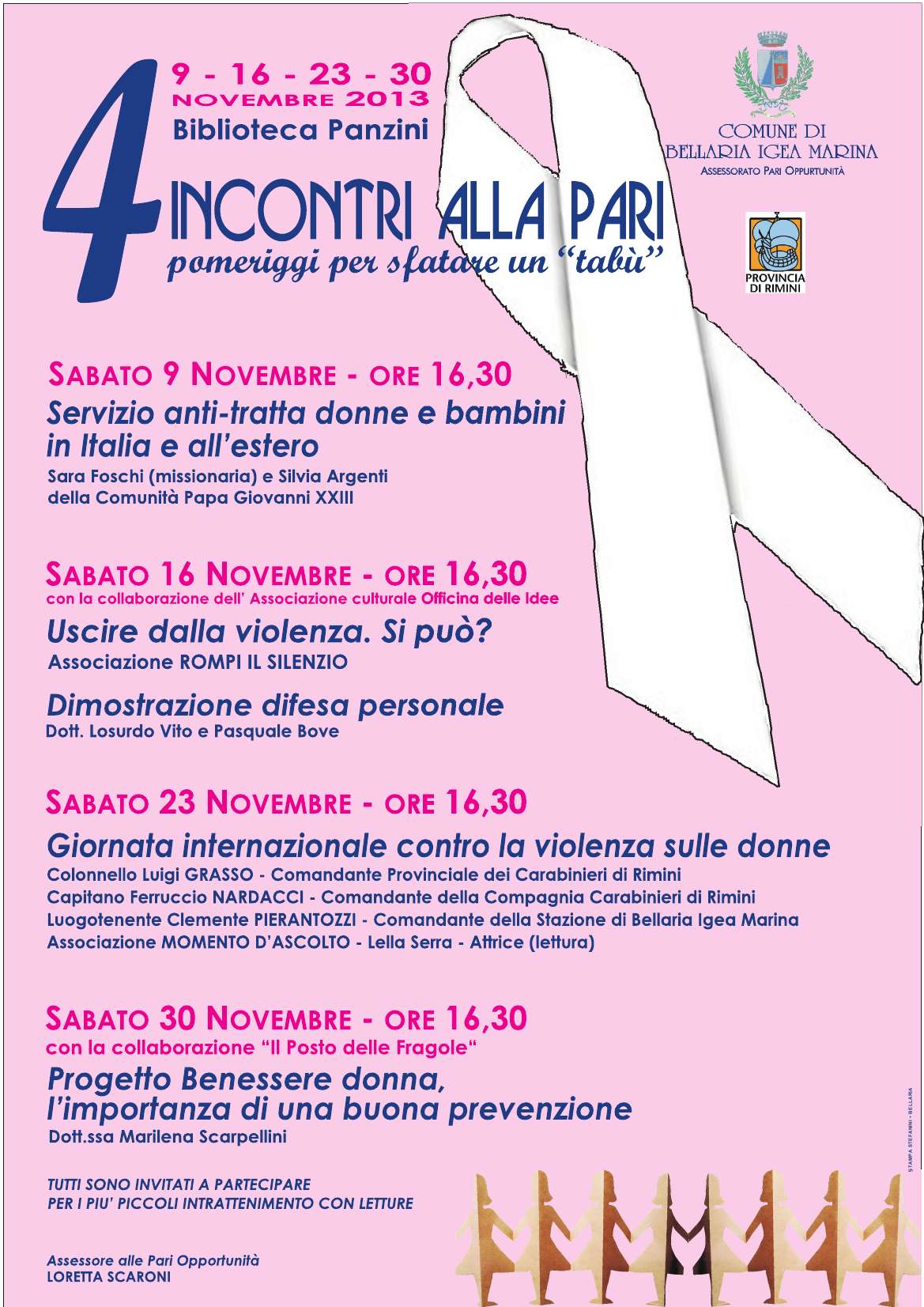 Iniziativa promossa dall’Assessorato alle Pari Opportunità del Comune di Bellaria Igea Marina - Assessore Loretta Scaroni in collaborazione con il Comando Provinciale dei Carabinieri, le Associazioni "Officina delle Idee per Bellaria Igea Marina" e “Posto delle fragole”, con il Patrocinio della Provincia di Rimini e con la partecipazione delle Associazioni “Rompi il silenzio” e “Momento d’ascolto”.