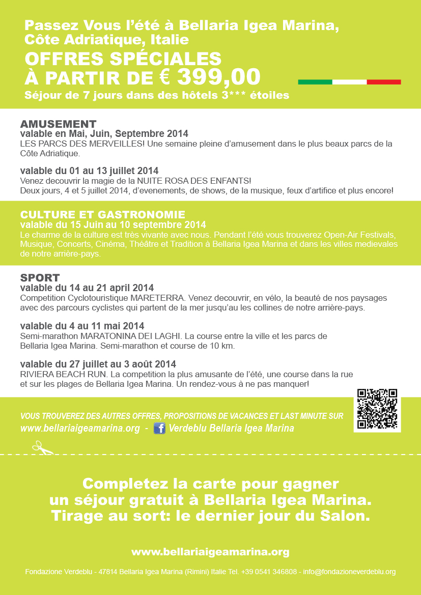 Fondazione Verdeblu partecipa anche nel 2014 alla fiera Tourissimo di Strasburgo in Francia, dal 14 al 16 febbraio 2014 ed organizza la presenza all'evento in co-marketing con APT Servizi Emilia Romagna e Unione di Prodotto Costa.