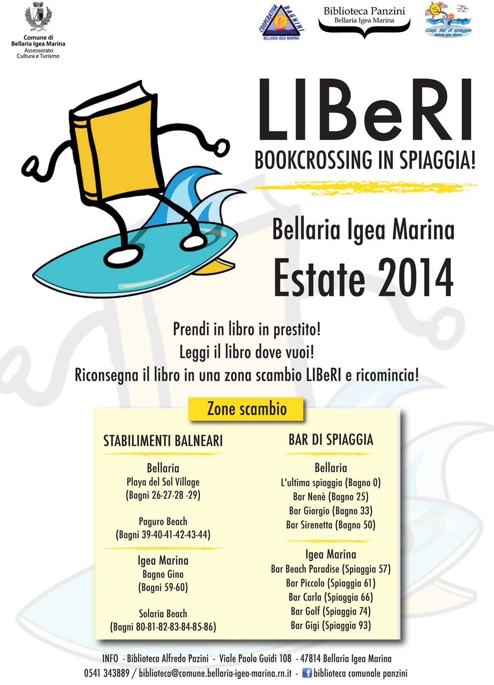 La Biblioteca Comunale "Alfredo Panzini" in collaborazione con Cooperativa Bagnini e Cooperativa Bar di Spiaggia di Bellaria Igea Marina organizza nei mesi di luglio e agosto 2014 LIBeRI – BOOKCROSSING IN SPIAGGIA.