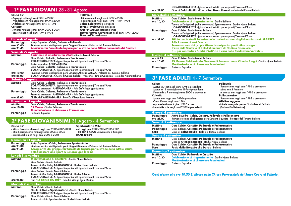 calcio a 7 Aspiranti, calcio a 7 Preadolescenti, calcio a 7 Adolescenti, calcio a 5 Juniores, calcio a 5 Seniores, pallavolo Primavera, pallavolo Speranza, calcio balilla, tennis tavolo, ANSPinDANZA, SPORTORATORIO Giovani, tiro con l'arco