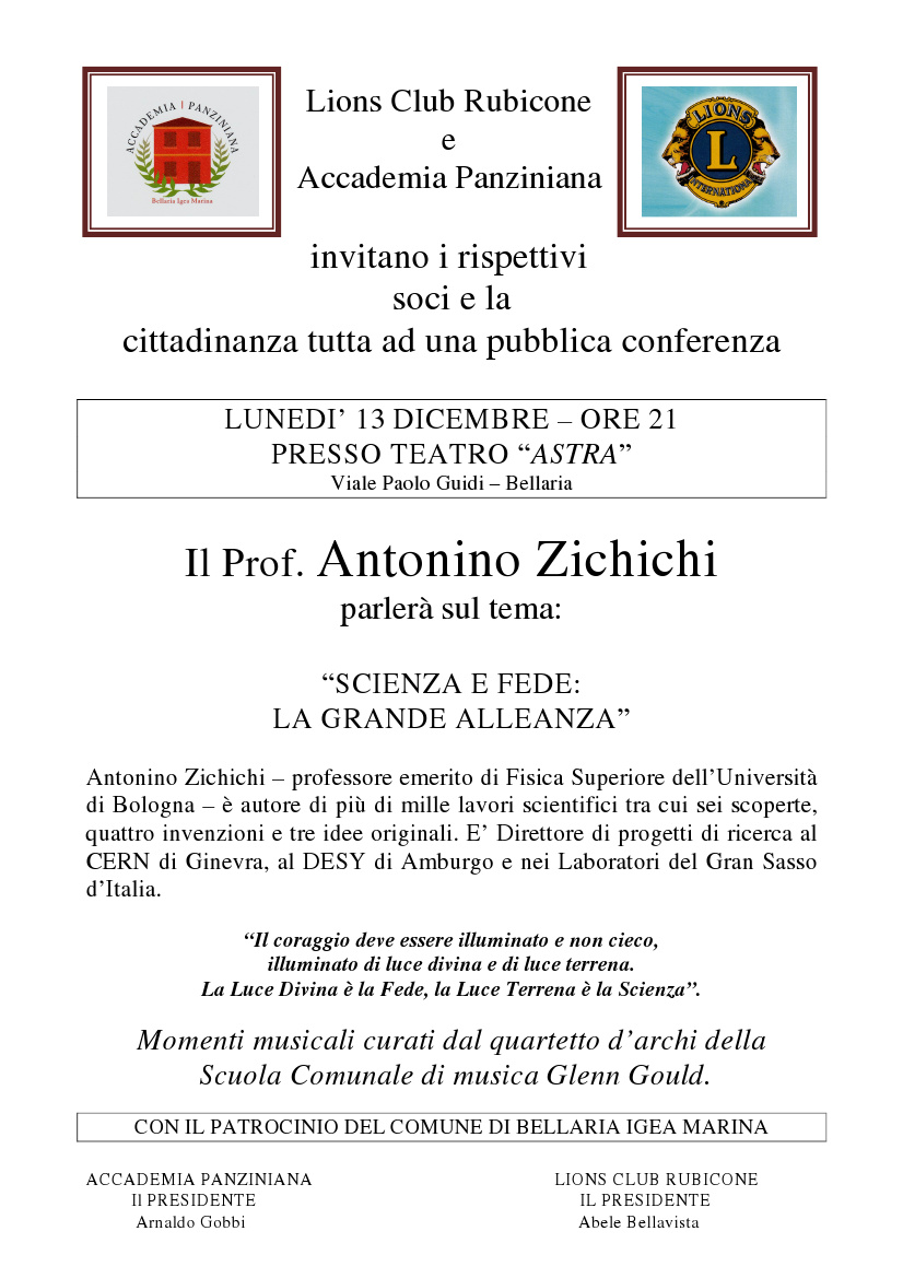 Conferenza pubblica del Professor Antonino Zichichi "Scienza e fede: la grande alleanza" organizzata da Lions Club del Rubicone e Accademia Panziniana, con il patrocinio del Comune di Bellaria Igea Marina.