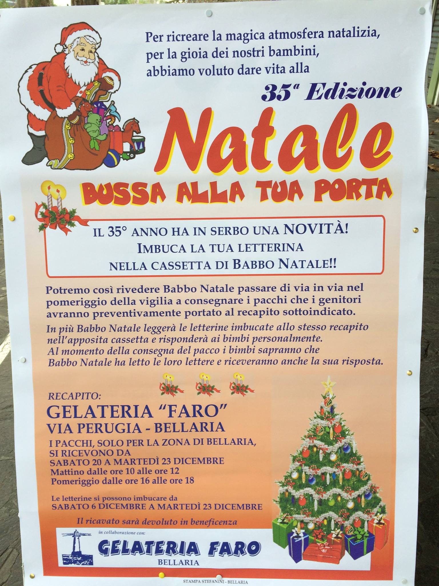 I doni vanno consegnati presso la Gelateria Faro, Via Perugia, Bellaria il 21, 22 e 23 dicembre, secondo i seguenti orari: mattino 10.00-12.00, pomeriggio 16.00-18.00.
