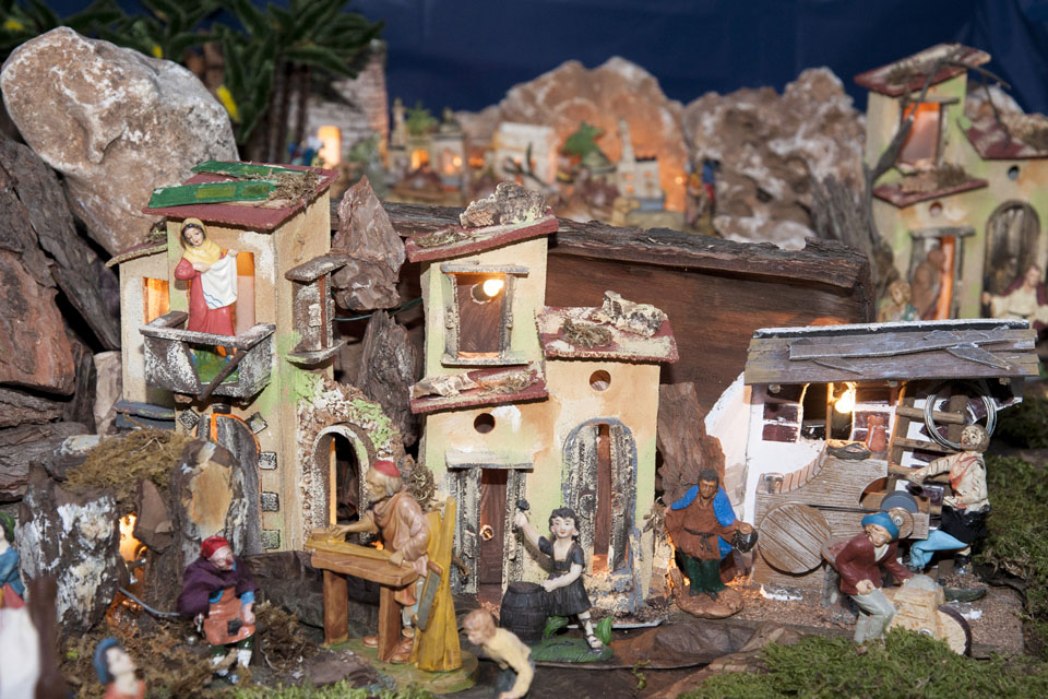 Presepe artistico meccanico che riproduce tutti i personaggi e i luoghi della tradizione, dalla grotta alle stelle, dai Re Magi ai pastori, dal bue e l’asinello agli agnelli con tanto di cascata e ponte levatoio.