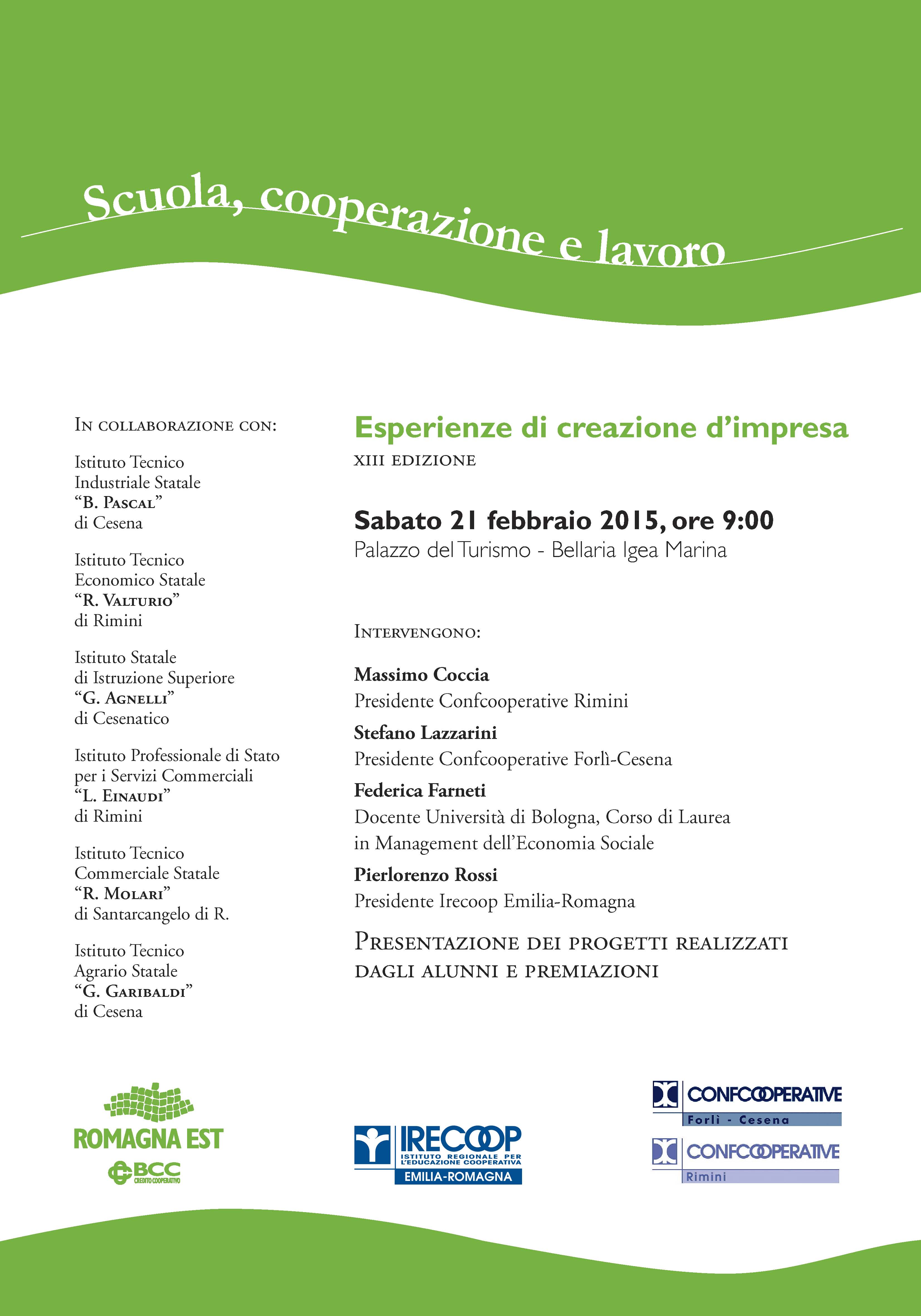 Sabato 21 febbraio, presso il Palazzo del Turismo di Bellaria Igea Marina, a partire dalle ore 09.00 si svolgerà la XIII edizione di "Scuola, cooperazione e lavoro" incontro pubblico aperto ai giovani sul tempo della cooperazione: ponte di congiunzione tra la scuola e il mondo del lavoro.
