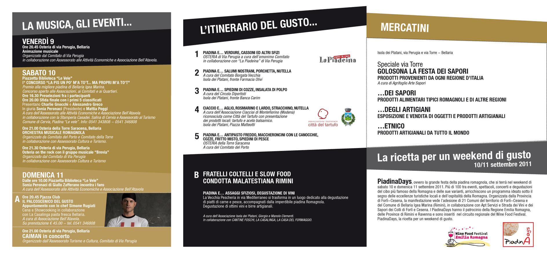 La Piadina anima e tradizione. Appuntamento ormai classico a Bellaria Igea Marina per festeggiare la tradizione romagnola del cibo e degli antichi mestieri. Degustazioni enogastronomiche, osterie, prodotti tipici, artigianato, musica e spettacoli.
