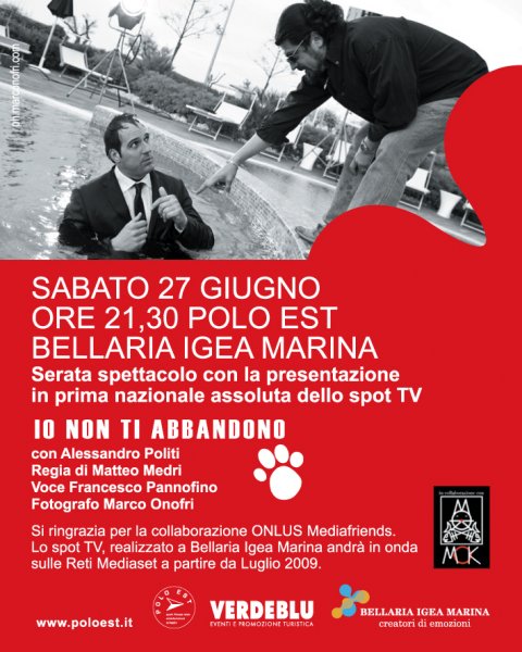 Serata spettacolo con la presentazione in anteprima nazionale dello spot TV "Io non ti abbandono" girato a Bellaria Igea Marina con Alessandro Politi. Regia di Matteo Medri.