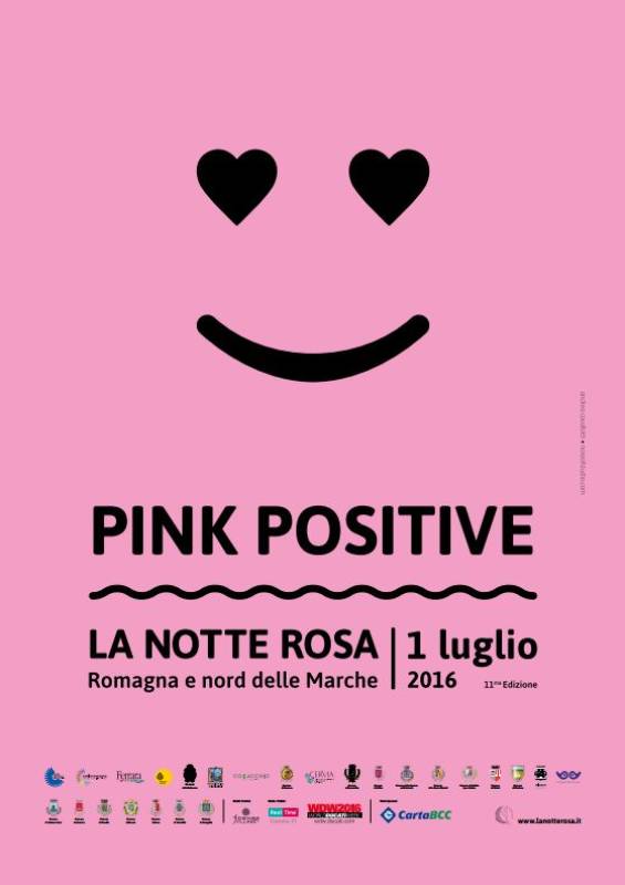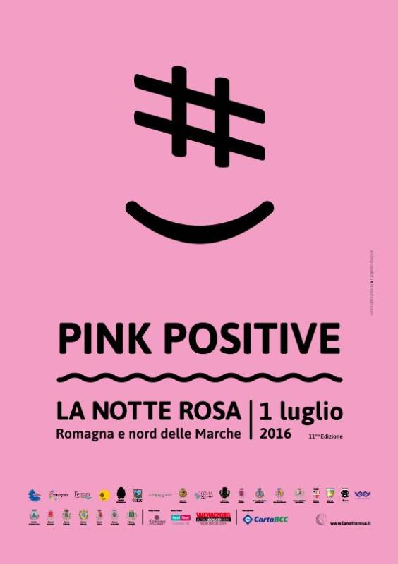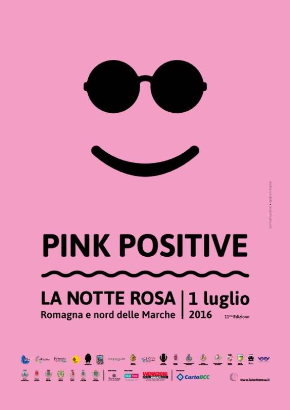 Il celebre motto del pensiero positivo, “Think Positive”, si fà rosa e diventa “Pink Positive” per annunciare, con un grande Smiley che domina la nuova immagine ufficiale, l’undicesima edizione della Notte Rosa, che venerdì 1 luglio invaderà con la sua energia contagiosa la Riviera Adriatica da Comacchio a Senigallia – Attesi 2,5 milioni di turisti, per un giro d’affari che lo scorso anno si è aggirato sui 200 milioni di euro.