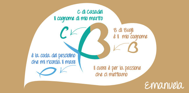 Il logo che Emanuela ha deciso di creare per il proprio hotel, è un logo molto personale che racchiude tutto ciò che le sta a cuore; la C come il cognome di suo marito, la B come il suo cognome, la forma del pesce che le ricorda il mare, e ultimo ma non meno importante, il cuore, che rappresenta la passione che la sua famiglia da sempre investe nell’accoglienza, non solo un mestiere ma tanto entusiasmo e amore.
