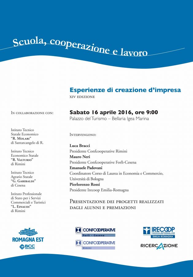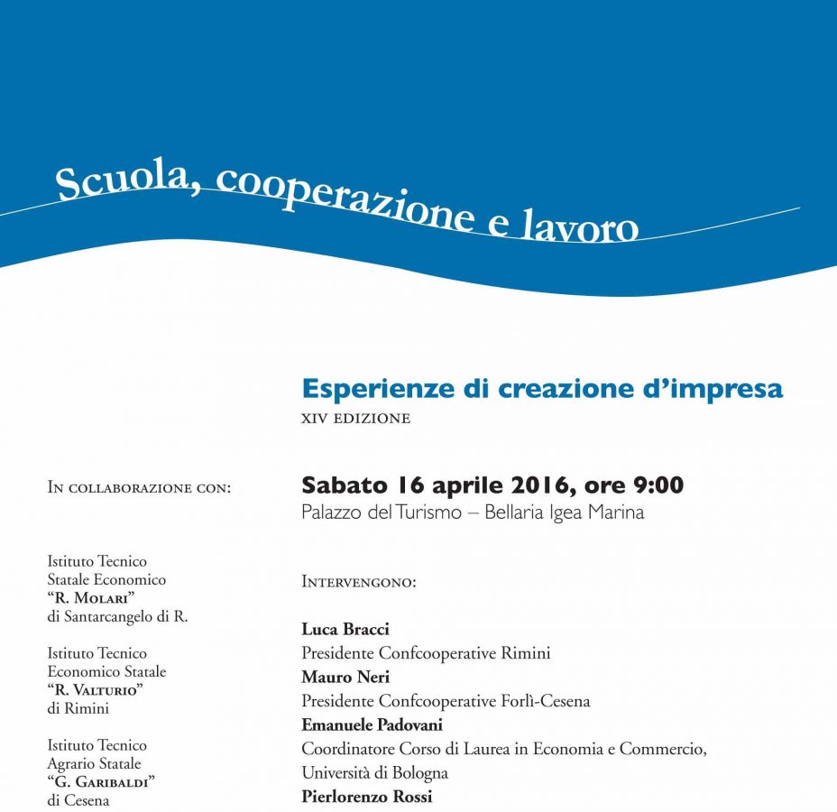 Sabato 16 aprile, presso il Palazzo del Turismo di Bellaria Igea Marina, a partire dalle ore 9.00 si svolgerà la 14^ edizione “Scuola, cooperazione e lavoro” incontro pubblico aperto ai giovani sul tema della cooperazione: ponte di congiunzione tra la scuola e il mondo del lavoro.