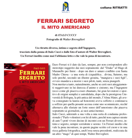 Italo Cucci, aderendo a sua volta a una sorta di condanna professionale (“Parlo volentieri con lei di tutto, perché non capisce niente di auto”) poté vivere decine di incontri con un Ferrari diverso, intimo e segreto, sempre sorridente e sereno. Un Ferrari inedito che vale la pena incontrare, in pagine scritte col cuore e in una ricca galleria fotografica, anch’essa senza precedenti, realizzata da un altro mago di quei tempi, Walter Breveglieri.