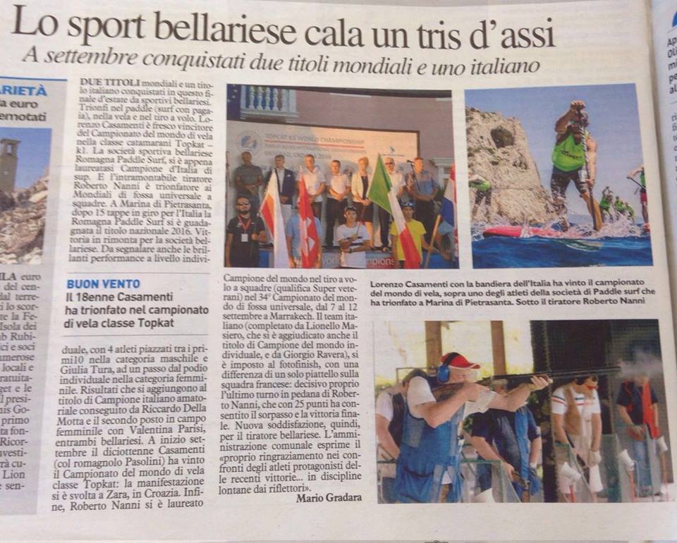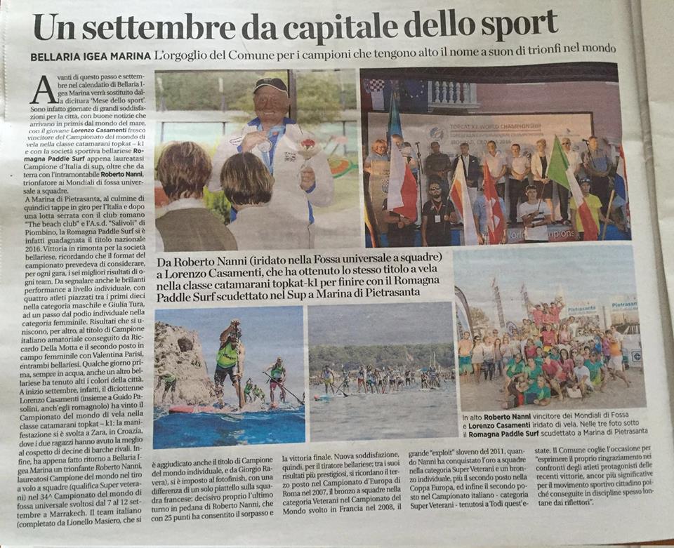 Giornate di grandi soddisfazioni per il movimento sportivo di Bellaria Igea Marina: le buone notizie arrivano dal mondo del mare, con il giovane Lorenzo Casamenti, fresco vincitore del Campionato del Mondo di vela nella classe catamarani topkat – k1 e con la società sportiva bellariese Romagna Paddle Surf, appena laureatasi Campione d'Italia di sup, oltre che dall’intramontabile Roberto Nanni, trionfatore ai Mondiali di fossa universale a squadre.