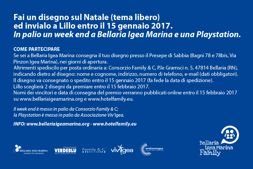 Se sei a Bellaria Igea Marina consegna il tuo disegno presso il Presepe di Sabbia (Bagni 78 e 78bis, Via Pinzon Igea Marina), nei giorni di apertura. Altrimenti spediscilo per posta ordinaria a: Consorzio Family & C, P.le Gramsci n. 5, 47814 Bellaria (RN), indicando dietro al disegno: nome e cognome, indirizzo, numero di telefono, e-mail (dati obbligatori).Il disegno va consegnato o spedito entro il 15 gennaio 2017 (fa fede la data di spedizione).