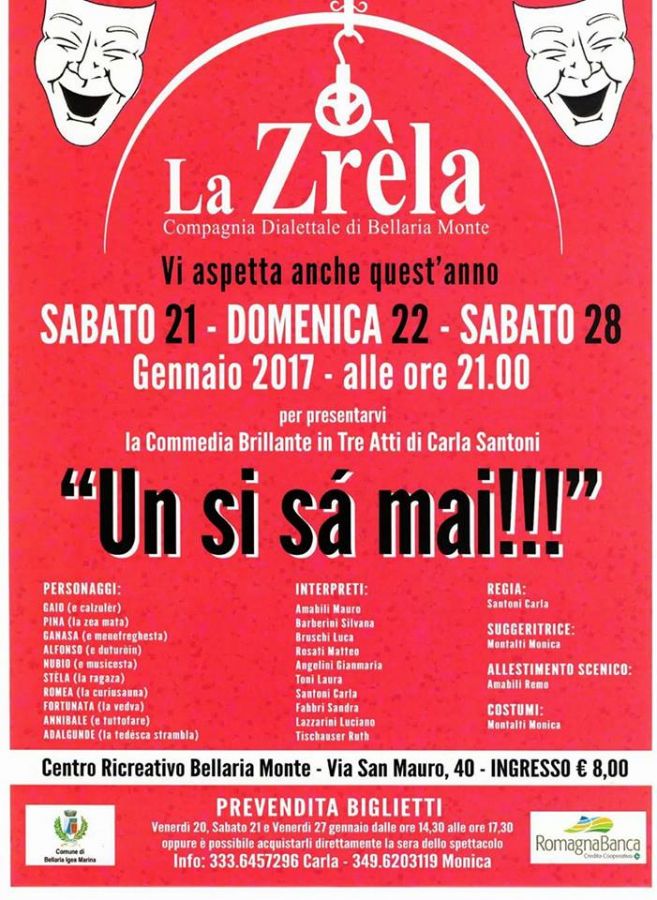 venerdì 20, sabato 21 e venerdì 27 gennaio 2017 dalle ore 14.30 alle ore 17.30 presso il Centro Ricreativo Bellaria Monte oppure direttamente la sera dello spettacolo