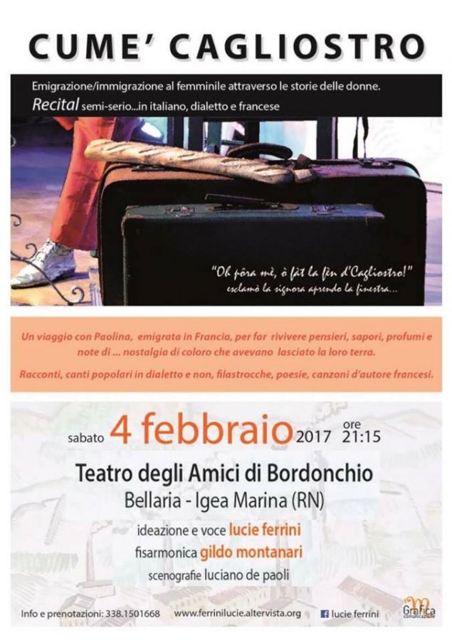 Appuntamento al Teatro degli Amici di Bordonchio alle ore 21.15 per un viaggio con Paolina, emigrata in Francia, per far rivivere pensieri, sapori, profumi e la nostalgia di coloro che avevano lasciato la loro terra.