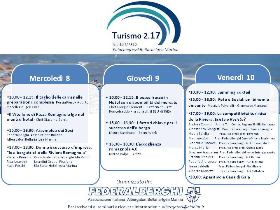 Il calendario di Turismo 2.17 prevede mattine impegnate in momenti tecnico operativi con show cooking di grande qualità dedicati al mondo alberghiero con Chef d’eccellenza nel settore della cucina tradizionale a km 0. Si partirà con i tagli migliori del vitellone di razza romagnola IGP carne di prima scelta e sana anche in hotel. Si mostrerà poi come ottimizzare i menù d’hotel attraverso l’utilizzo dell pesce seguendo le disponibilità di stagione del nostro mare. I pomeriggi e le sere di Turismo 2.17 proseguiranno con importanti convegni e seminari formativi tenuti dai più competenti esperti di settore in relazione alle tematiche previste in programma: contenuti e relatori di grande attualità per gli imprenditori alberghieri, operatori e professionisti del settore turistico.