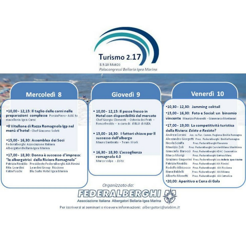 Federalberghi Associazione Italiana Albergatori Bellaria Igea Marina, con Turismhotels ha organizzato mercoledì 8, giovedì 9 e venerdì 10 marzo presso il Palacongressi di Bellaria Igea Marina: Turismo 2.17, l’attesissima convention annuale degli albergatori di Bellaria Igea Marina, uno degli appuntamenti più importanti della Riviera per gli imprenditori del settore turistico ricettivo.