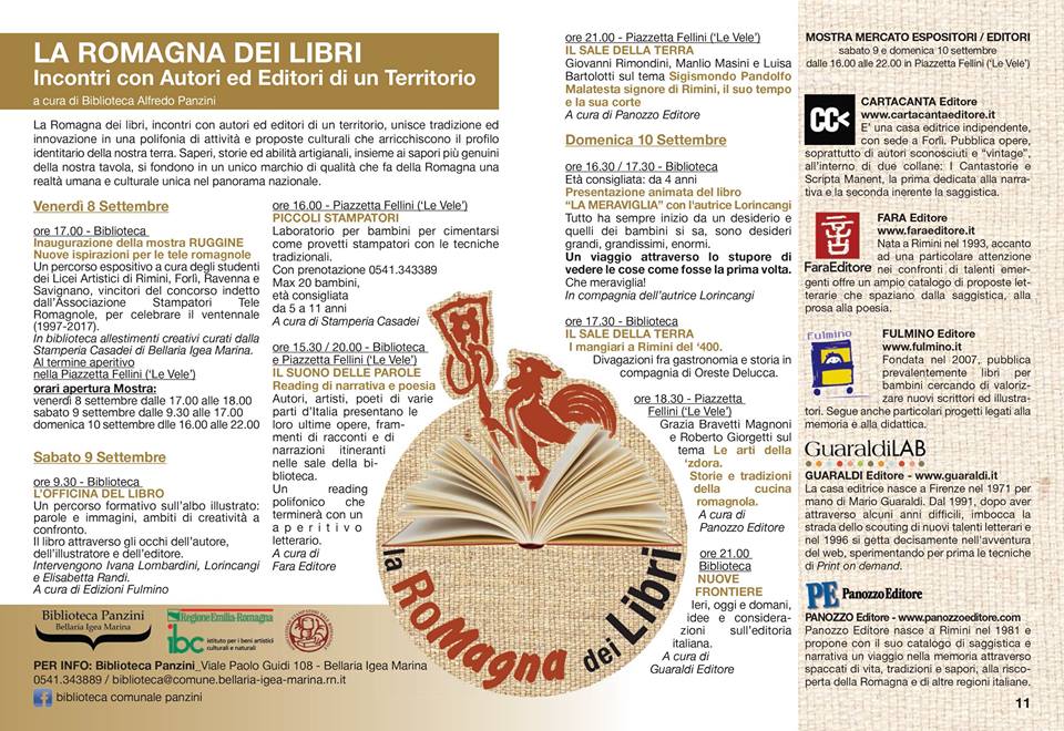 La Romagna dei libri, incontri con autori ed editori di un territorio, unisce tradizione ed innovazione in una polifonia di attività e proposte culturali che arricchiscono il profilo identitario della nostra terra. Saperi, storie ed abilità artigianali, insieme ai sapori più genuini della nostra tavola, si fondono in un unico marchio di qualità che fa della Romagna una realtà umana e culturale unica nel panorama nazionale.