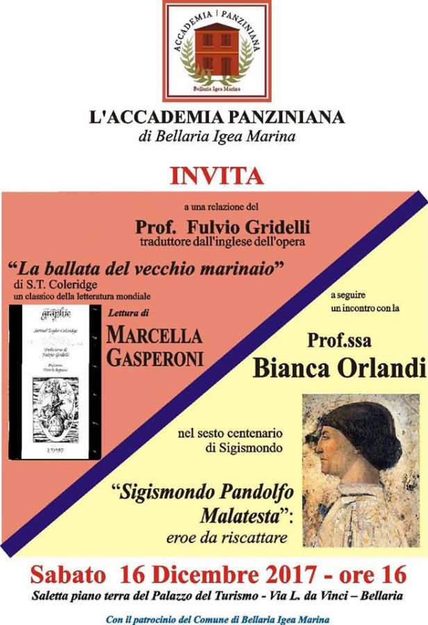 Incontro culturale organizzato dall'Accademia Panziniana in programma sabato 16 dicembre 2017, ore 16.00 | saletta piano terra del Palazzo del Turismo.