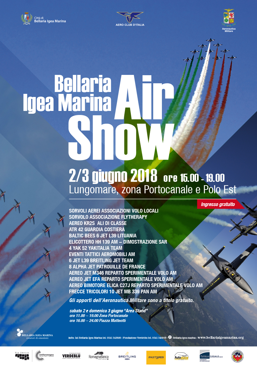 Grandi protagoniste saranno le Frecce Tricolori, che per il quinto anno consecutivo coloreranno i cieli di Bellaria Igea Marina con i leggendari fumi bianchi, rossi e verdi. La Pattuglia Acrobatica Nazionale, considerato il team acrobatico più prestigioso a livello internazionale, sarà la punta di diamante di uno spettacolo animato da interpreti di prim’ordine: tra questi, la Patrouille de France, la Pattuglia Acrobatica Nazionale francese, una delle più antiche e importanti al mondo, ma anche aerei del Reparto Sperimentale di volo dell’Aeronautica Militare, l’elicottero HH139 del 5^ Stormo di Cervia, il velivolo ATR42 della Guardia Costiera, il Breitling Jet Team composto da sei jet L39, un team civile formato da quattro YAK52, i sei L39 lituani dei Baltic Bees e tante altre sorprese di spessore internazionale.