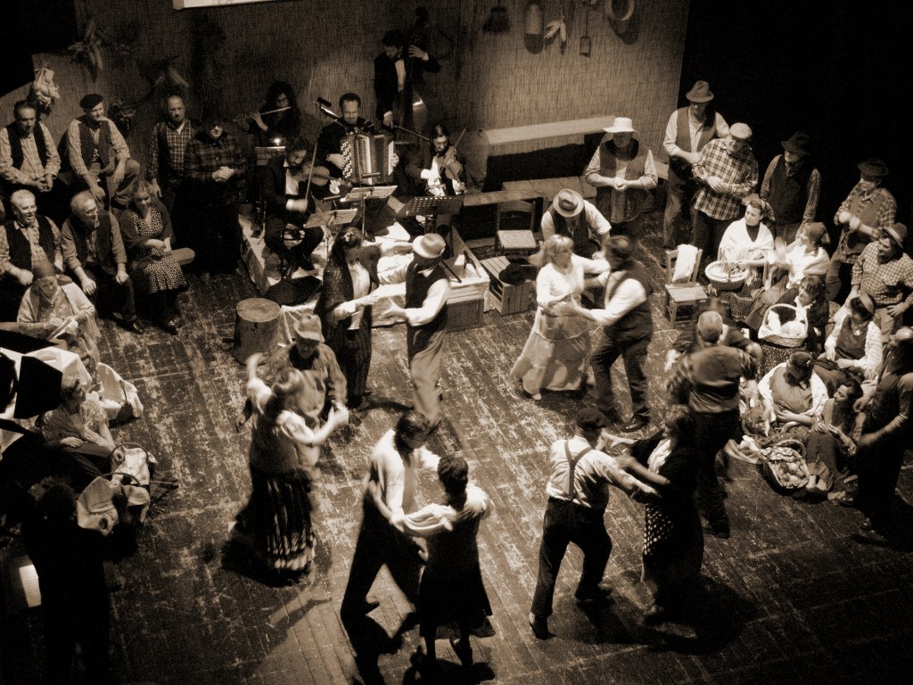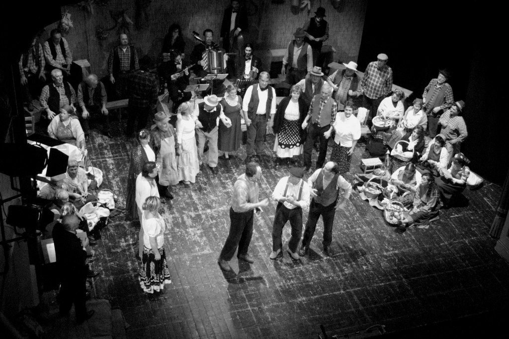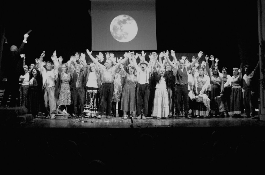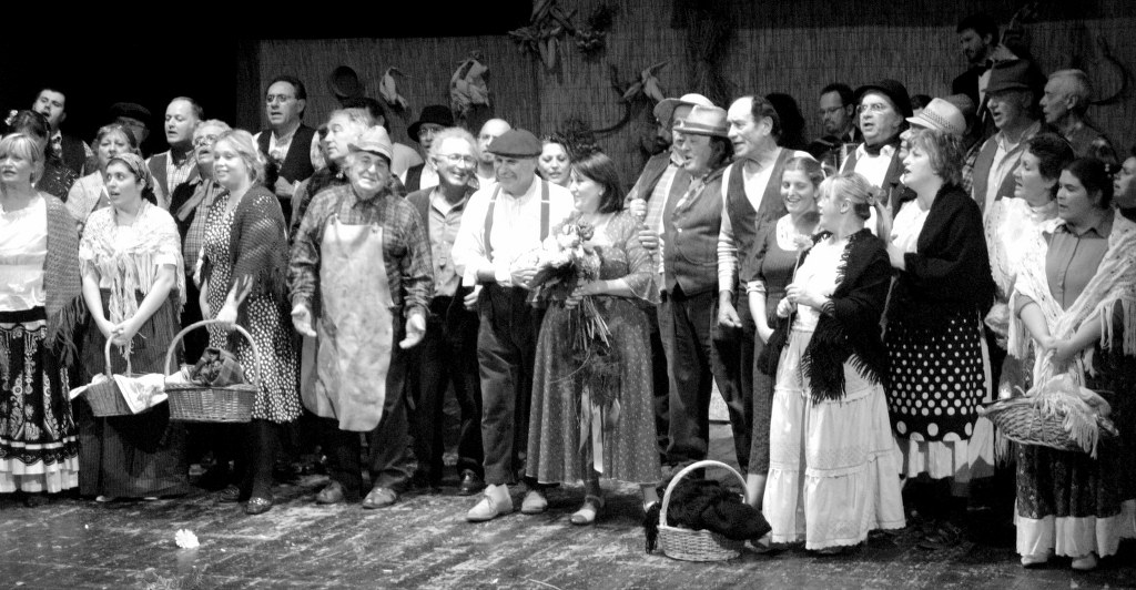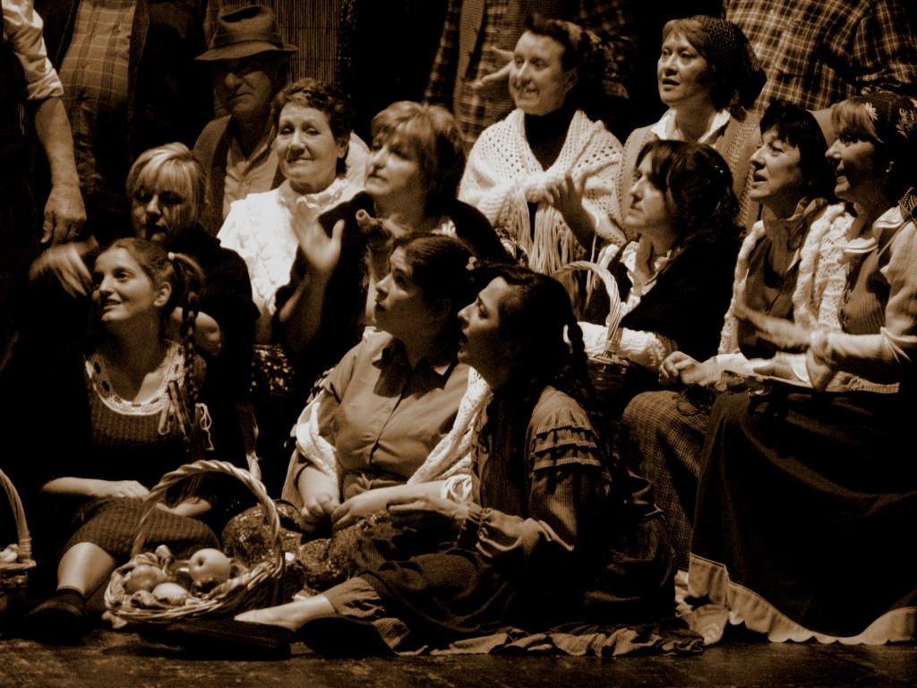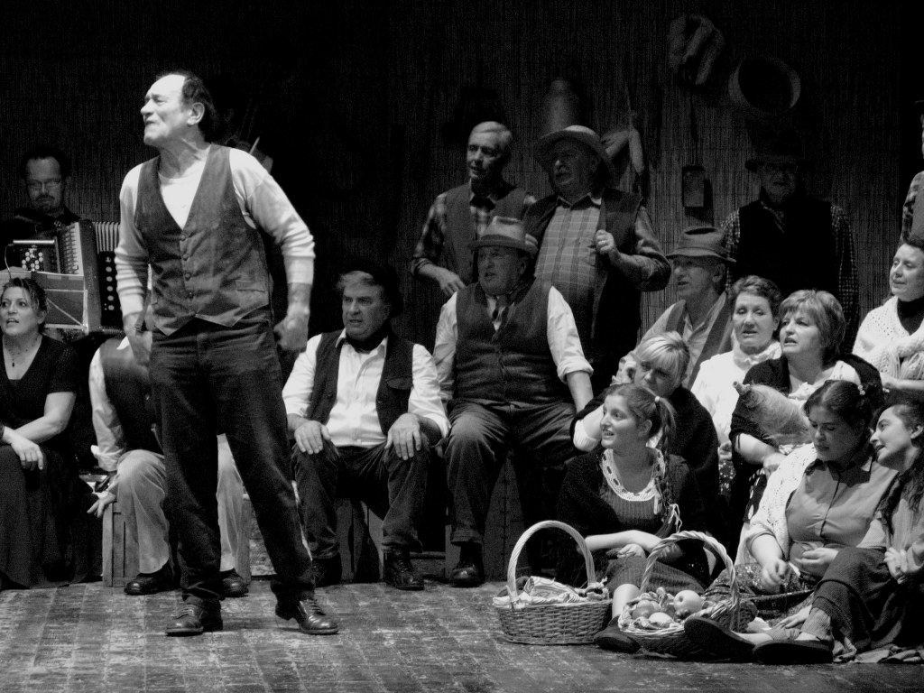I coristi diventano così attori oltreche cantori di questa storia musicale che si svolge su un'aia, in un giorno di festa dove inevitabilmente insieme a balli e canti si intreccia una storia d'amore fra Pirèta e la Zirumèla.