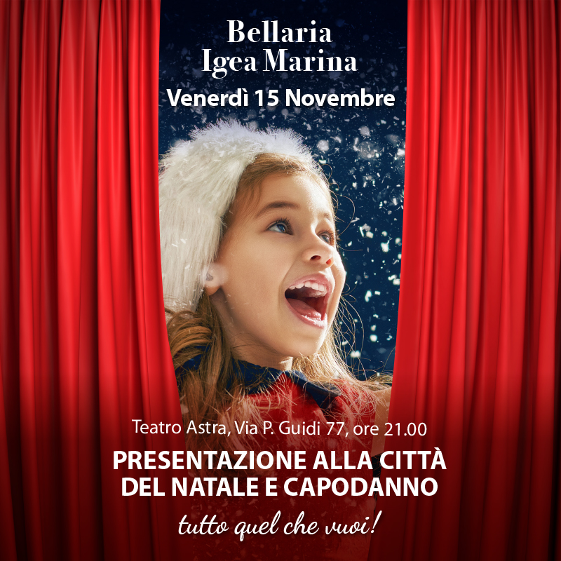 Appuntamento al Teatro Astra alle ore 21.00 per la presentazione del programma eventi di Natale Capodanno 2019-2020 a Bellaria Igea Marina.