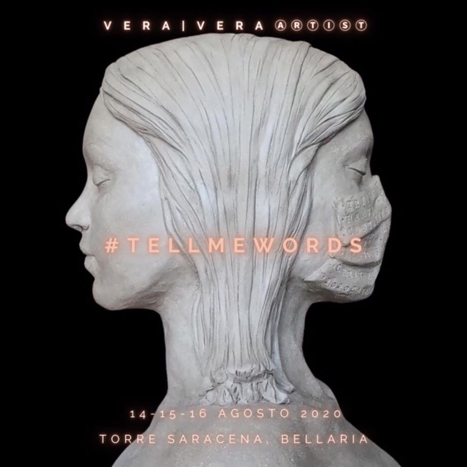 “É la prima mostra personale dell’artista Vera Vera a Bellaria Igea Marina, #Tellmewords (dimmi parole) é la domanda che Vera ha posto al pubblico online di Instagram per completare le Opere di questo ciclo, opere completamente leggibili in diverse lingue su cui l’artista ha riscritto anche nomi, parole provocatorie e a volte frasi intere in lingue, anche sconosciute, comunicategli dal pubblico. Se anche tu hai partecipato prova a trovare la tua parola."