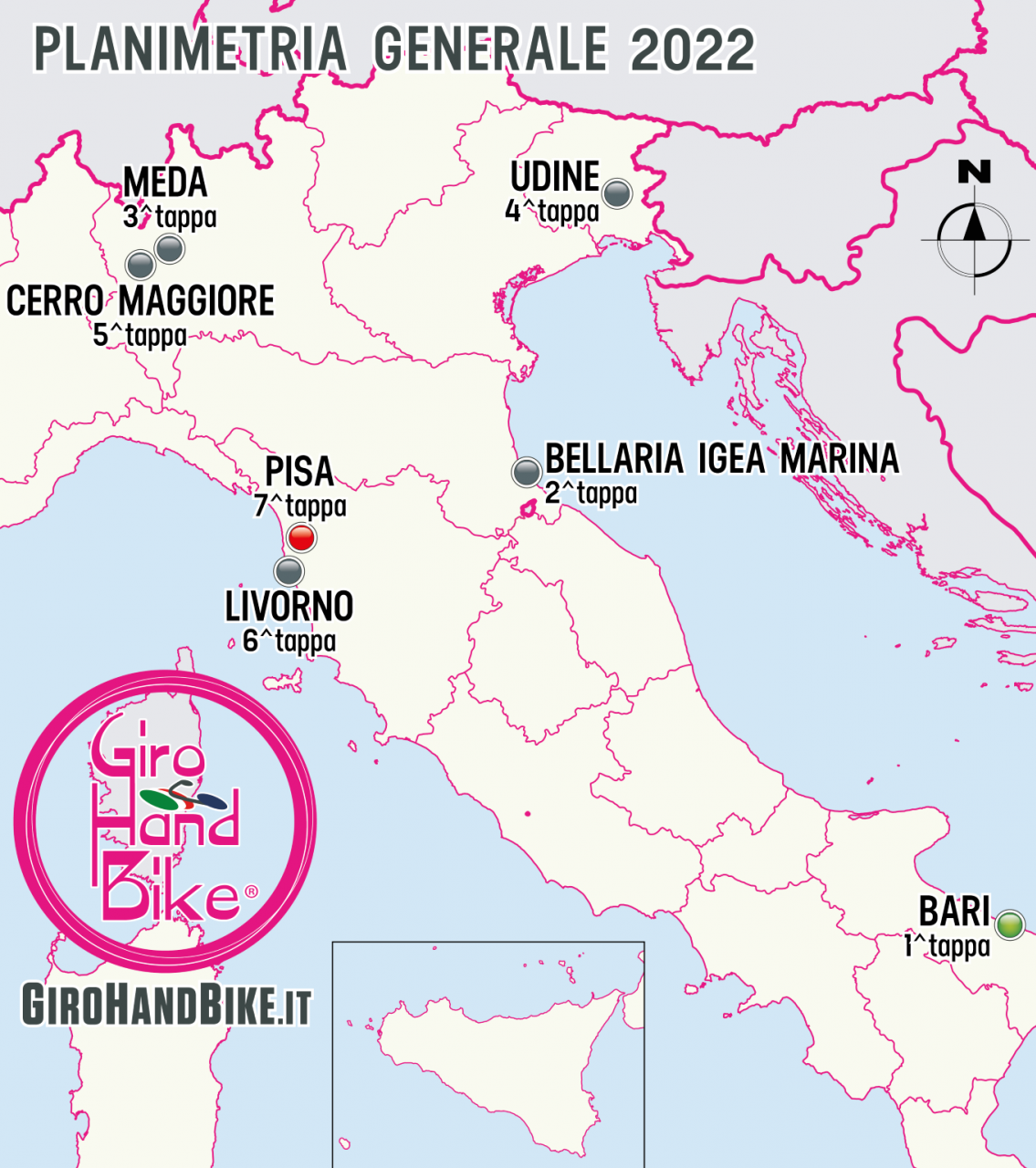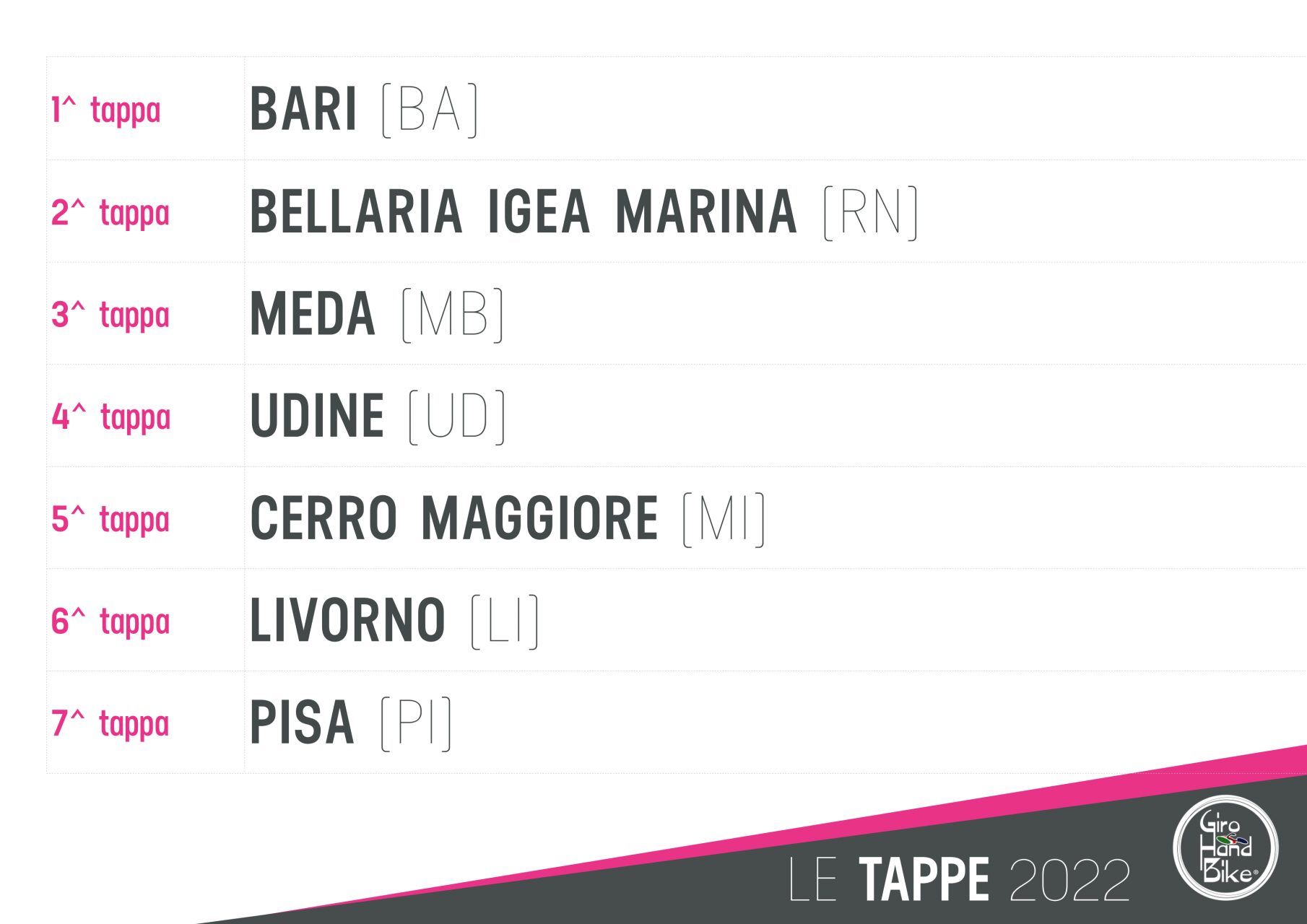 Il Giro Handbike 2022 partirà da Bari (BA), risalendo verso Bellaria Igea Marina (RN) e proseguendo poi per Meda (MB), Udine (UD), Cerro Maggiore (MI), Livorno (LI) e Pisa (PI): prossimamente sarà annunciato ufficialmente il calendario con tutte le date delle sette tappe. Un’edizione, questa del 2022, totalmente nuova ed innovativa come descritta dal Patron del Giro Handbike, Andrea Leoni, che la definisce come una delle migliori edizioni con percorsi articolati e complessi ma anche più easy e divertenti che offriranno agli atleti paralimpici in gara, spettacolari scenari italiani.
