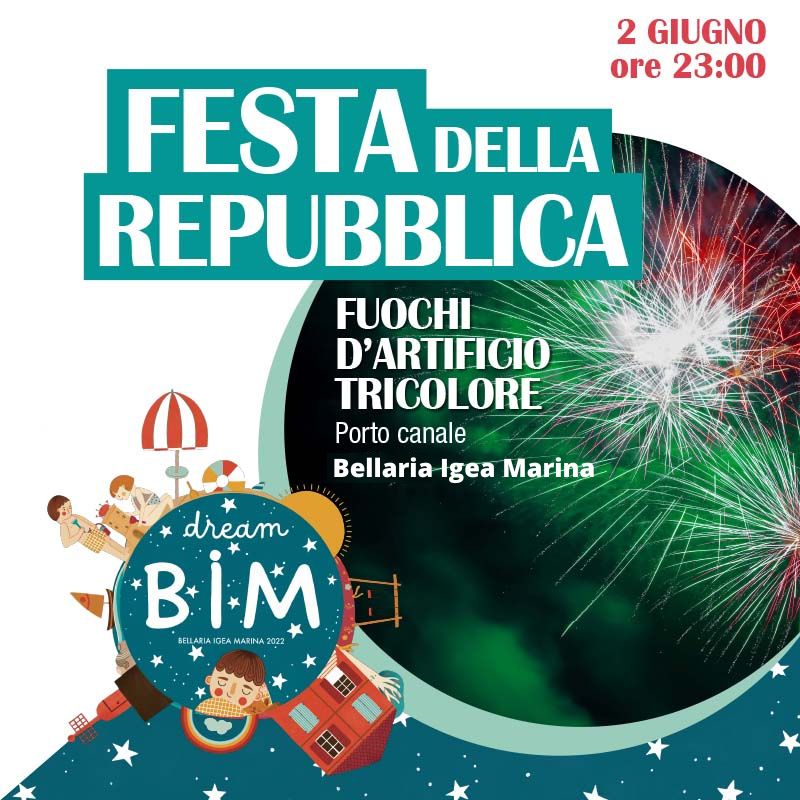 Spettacolo pirotecnico con fuochi d'artificio tricolore per celebrare assieme la Festa della Repubblica, sullo sfondo del porto canale di Bellaria Igea Marina.