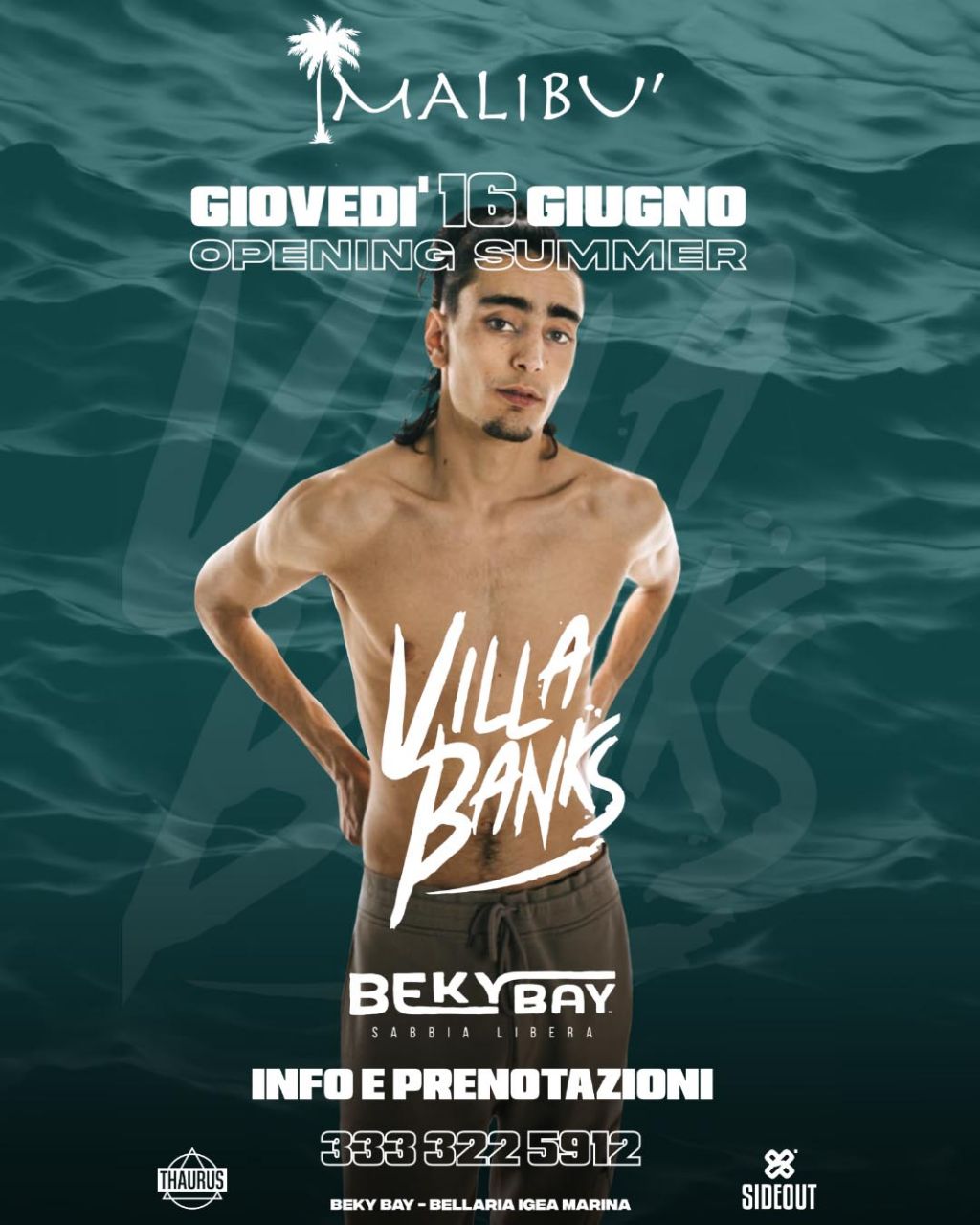 Giovedì 16 giugno al Beky Bay-Spiaggia Libera, torna Malibù con le serate più calienti dell’estate e per inaugurare la stagione si parte con il botto.. arriva VILLABANKS!