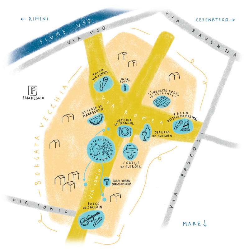 La manifestazione si tiene nel nucleo storico della “Borgata Vecchia” di Bellaria, nelle vie Ionio e Romea. Si tratta di un importante appuntamento culturale nato nel 1993 su iniziativa del Laboratorio di documentazione e ricerca sociale del Comune di Bellaria Igea Marina, in collaborazione con il Comitato Borgata Vecchia, e che oggi si avvale anche del supporto dell’Accademia InArte di Forlì e di Fondazione Verdeblu. Il suo intento è anche di creare un forte momento di socializzazione nella vita del paese nel momento del “passaggio” alla stagione turistica estiva, e di riportare alla luce il nucleo ottocentesco di “Borgo Osteria”, legandosi alla sua storia e alla sua gente. Il Festival, infatti, coinvolge spazi domestici, cortili interni e la storica via Romea (la via consolare Popilia-Annia, 132 a.C.), che per l’occasione si trasformano in osterie, dove le famiglie del posto cucinano cibi tradizionali mentre gruppi di suonatori improvvisano canti e balli.