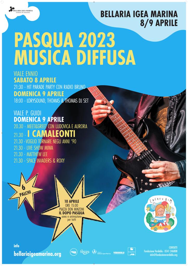 Sabato 8 e domenica 9 aprile, viale Ennio e Viale P. Guidi di Bellaria Igea Marina, si animano con il grande evento PASQUA 2023 | MUSICA DIFFUSA con sei palchi e tanti momenti di spettacolo tra, show, dj set e concerti che diffonderanno musiche e atmosfere di diversi generi musicali! Dalle hit parade di Radio Bruno, al dj set con Lorysound, Thomas &Thomas, Space Invaders & Roxy; le sigle cartoon con il Live Show MIWA; le canzoni più famose degli anni 90’ con il live show “Voglio tornare negli anni ‘90”; lo spettacolare Show musicale con il pianista performer Matthew Lee ed il Concerto della band “I Camaleonti” con le loro più celebri canzoni che hanno segnato la storia della musica italiana. Non mancheranno appuntamenti dedicati anche alle nuove generazioni come il Meet&Greet con le Youtubers Ludovica e Aurora!