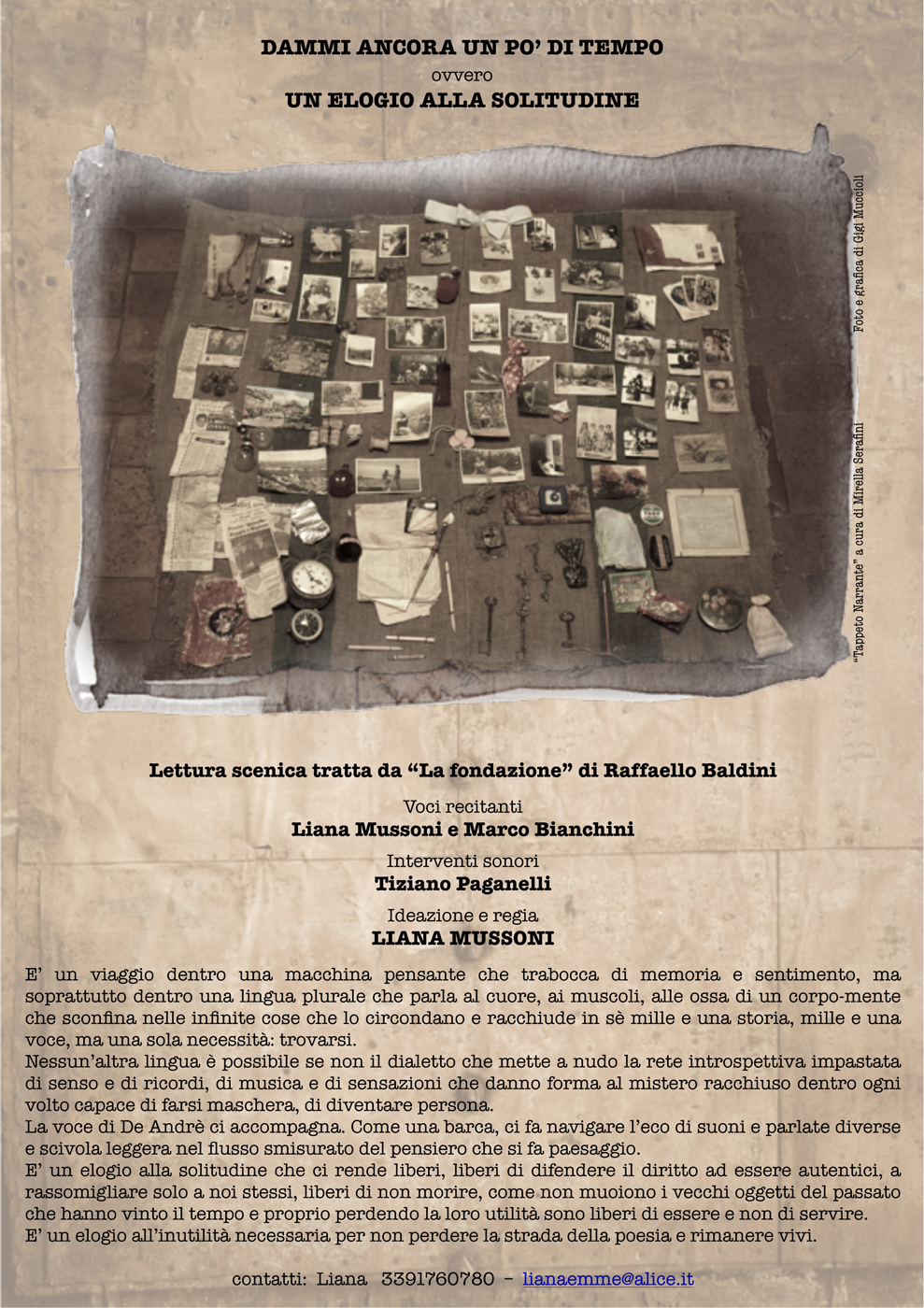 Lettura scenica tratta da "La Fondazione" di Raffaello Baldini. Voci recitanti Liana Mussoni e Marco Bianchini. Interventi sonori di Tiziano Paganelli.