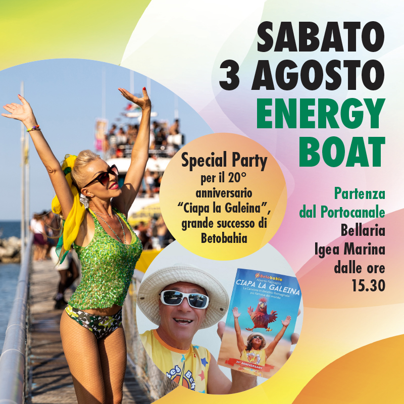 Sabato 3 agosto, l’Energy Boat di Bellaria Igea Marina è pronta a salpare con un’uscita special! L’aperitivo itinerante con dj set e discoteca in mare, a bordo della motonave Super Tayfun, ospiterà un personaggio iconico dell’estate romagnola: il vulcanico cantautore, re dei tormentoni estivi, Betobahia!