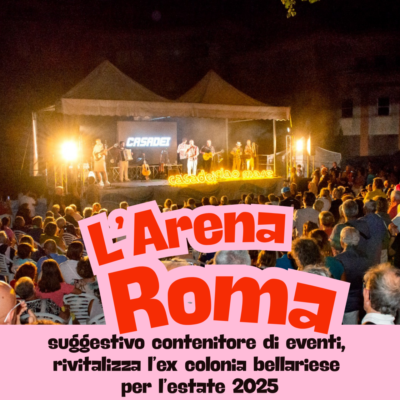 Dopo l'affascinante esperienza della riapertura del parco della Colonia Roma durante l'estate del 2023, si è voluto rinnovare l'offerta e rilanciare uno spazio che rappresenta per la città un luogo del cuore e del ricordo. In seguito alla conclusione dei lavori di ripristino degli spazi esterni della Colonia, è già stato ospitato un grande evento in occasione della Notte Rosa: il concerto di Mirko Casadei POPular folk orchestra che ha riempito la corte esterna della Colonia bellariese con un folto pubblico, decretando così l’avvio degli appuntamenti presso l’Arena Roma.