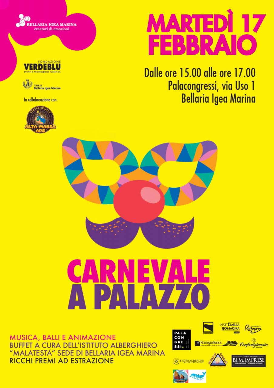 Una grande festa di Carnevale al Palacongressi di Bellaria Igea Marina, che per l'occasione si trasformerà in un Palazzo festoso e colorato con musica, balli e intrattenimento per festeggiare insieme il Carnevale!